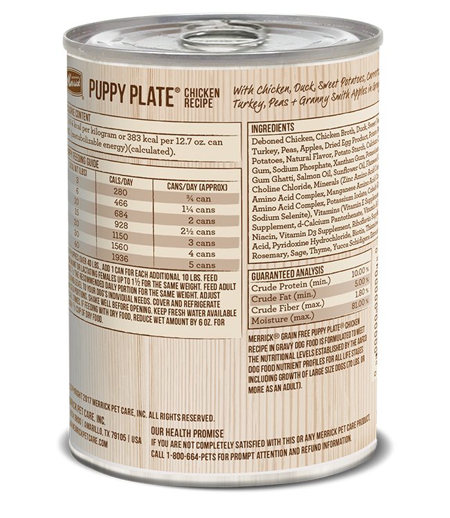 Merrick Grain Free Puppy Plate Chicken Recipe in Gravy Dog Food is formulated to meet the nutritional levels established by the AAFCO Dog Food Nutrient Profiles for All Life Stages including growth of large size dogs (70 lbs or more as an adult).